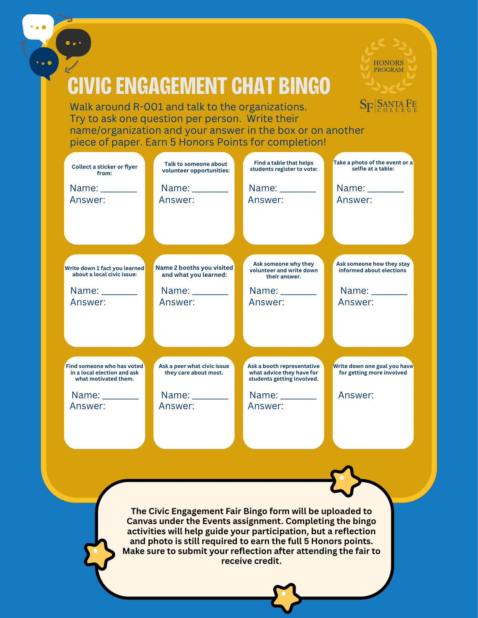 Walk around the R-001, talk to organizations, ask questions, and complete your bingo sheet to earn 5 Honors Points! Don’t forget: a reflection and photo are required to get full credit. Use the bingo form and instructions above then submit all material on Canvas → Events. Get out there and engage!