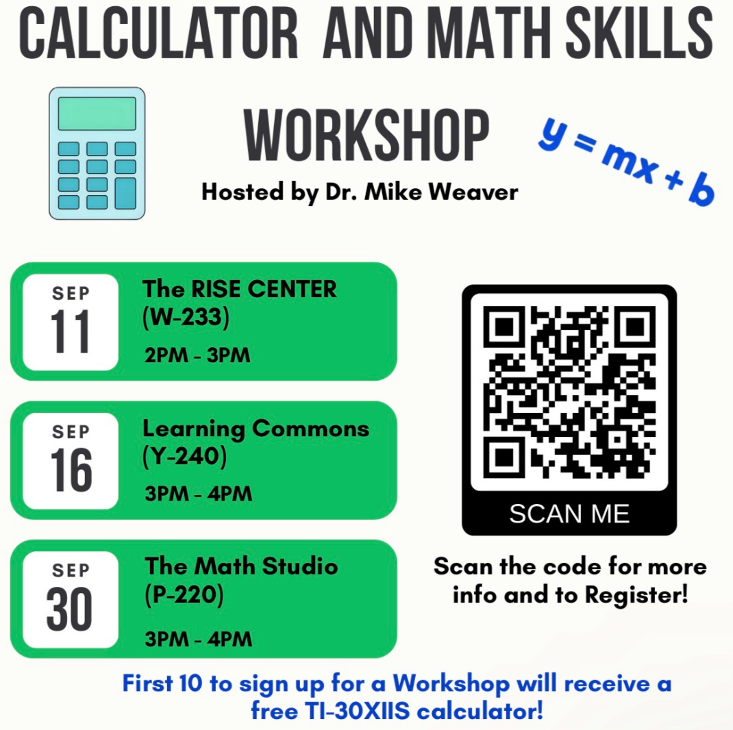 Join Dr. Mike Weaver for the Calculator and Math Skills Workshop to learn how to use calculators efficiently and master key math concepts like y = mx + b. Attend any workshop to earn 5 Honors points, or complete all three sessions for 20 points. Don’t miss this chance to sharpen your skills and get a free TI-30XIIS calculator if you’re one of the first 10 to sign up!