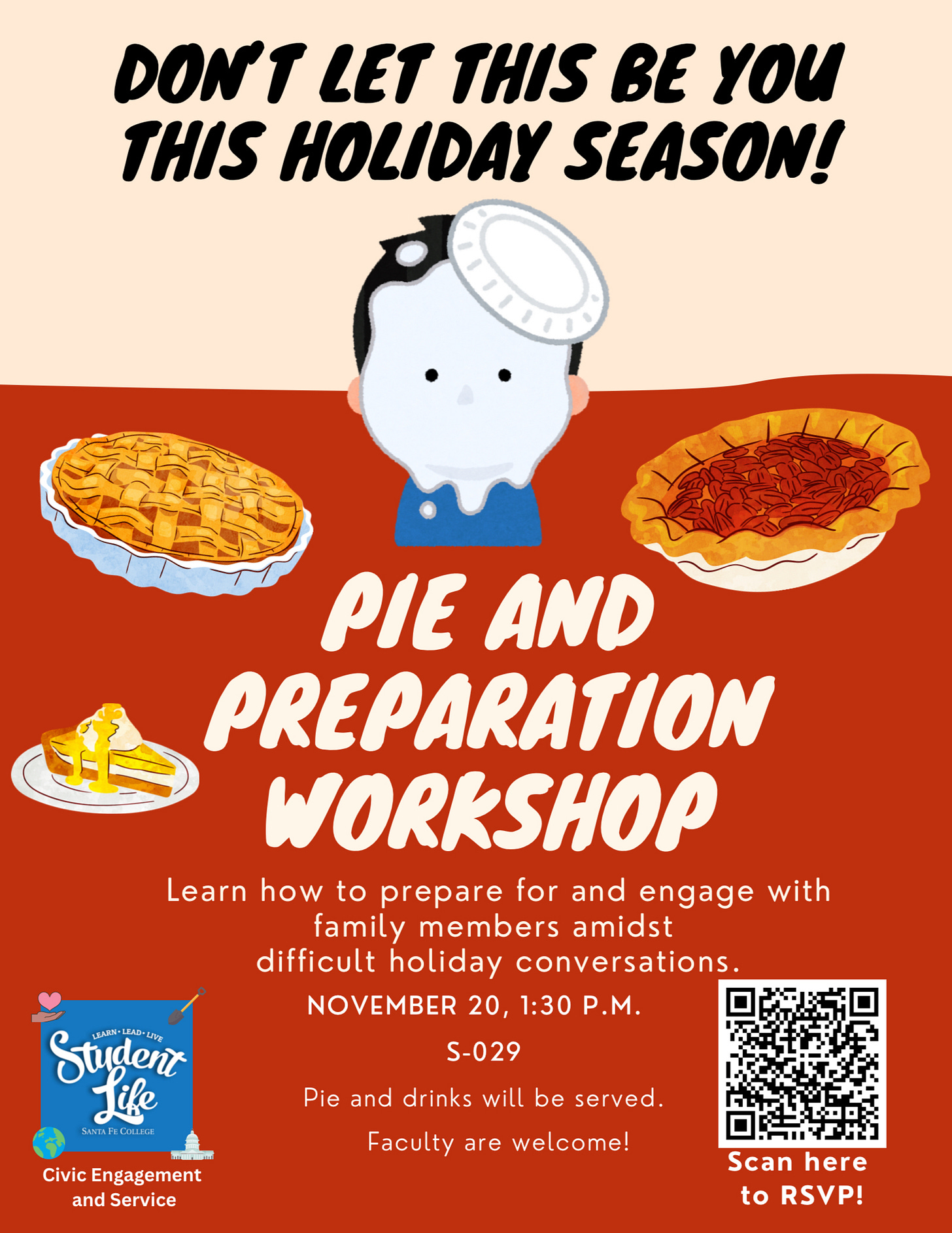 Don’t let stressful holiday conversations get the best of you this season! Join ICDP and the Civic Engagement Team at Santa Fe College for the Pie & Preparation Workshop on November 20 at 1:30 PM in S-029. Learn strategies to prepare for and engage with family members during difficult conversations. Pie and drinks will be served. All students and faculty are welcome, bring a friend!