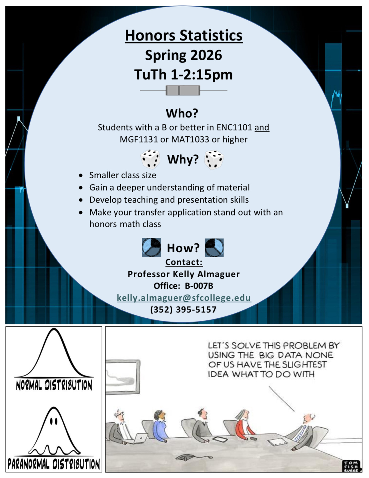 Honors Statistics will be offered in Spring 2026 on Tuesdays and Thursdays from 1:00–2:15 PM. Eligible students must have earned a B or higher in ENC1101 and in MGF1131, MAT1033, or a higher-level math course.