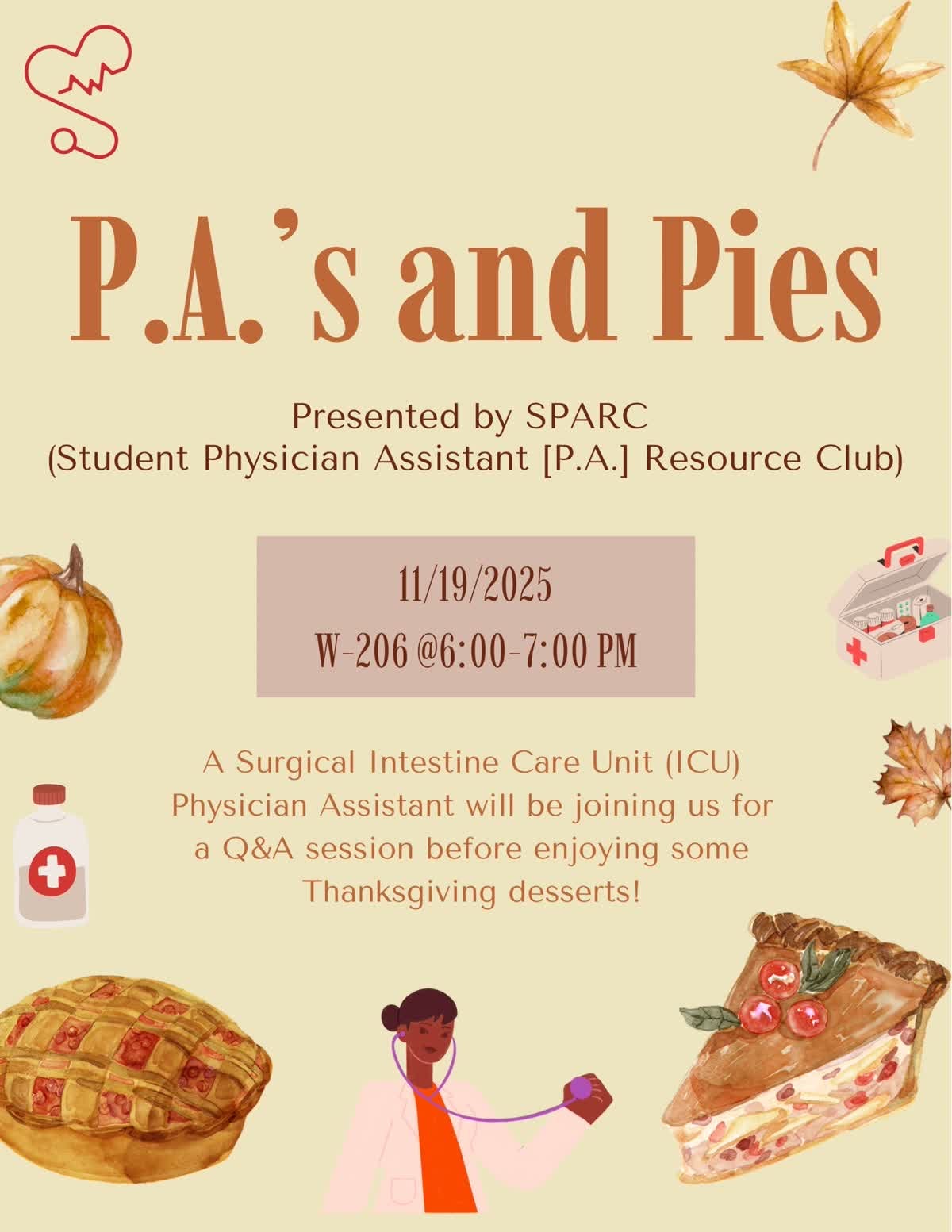 Join SPARC for P.A.’s and Pies on Nov. 19, 2025, 6–7 PM, W-206!