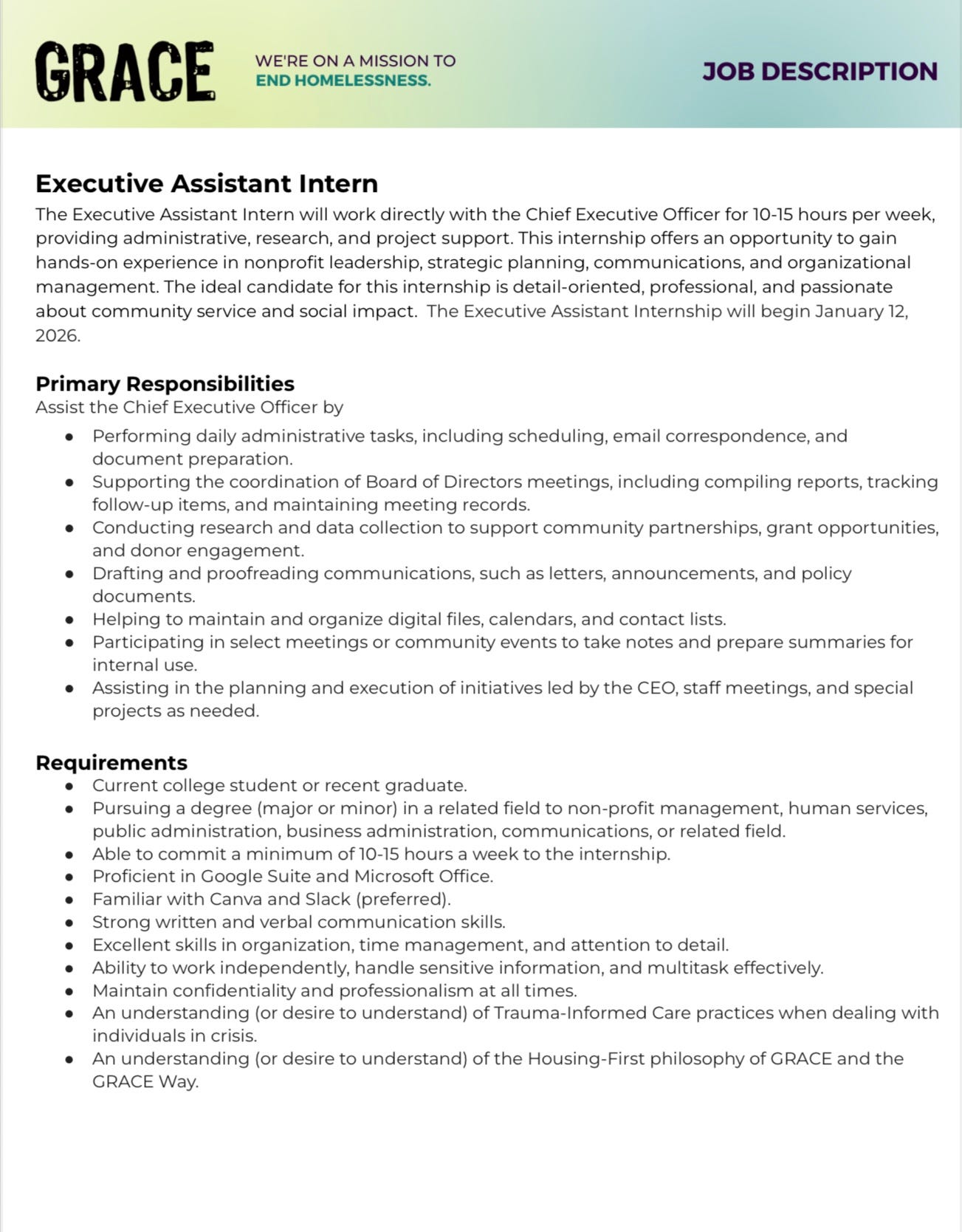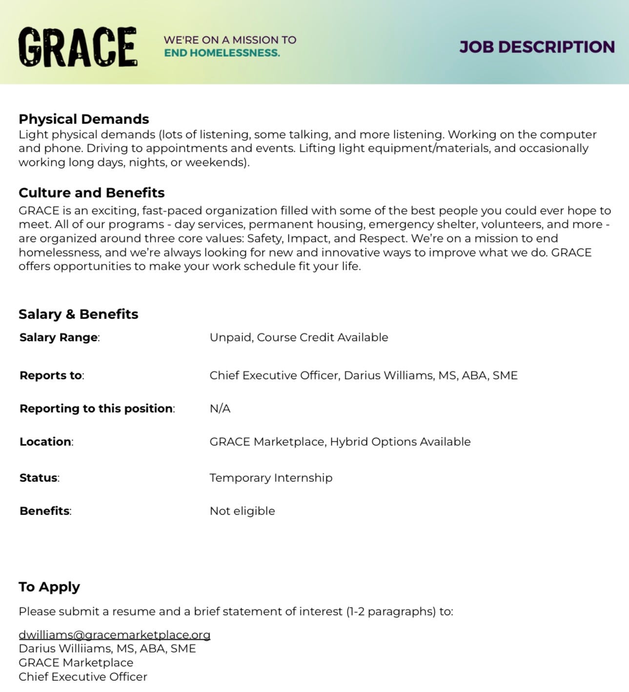 GRACE Marketplace is offering a unique temporary internship opportunity for students seeking hands-on experience in social services, nonprofit leadership, and community impact. Interns will work directly with GRACE leadership and support programs designed to help end homelessness in our community.