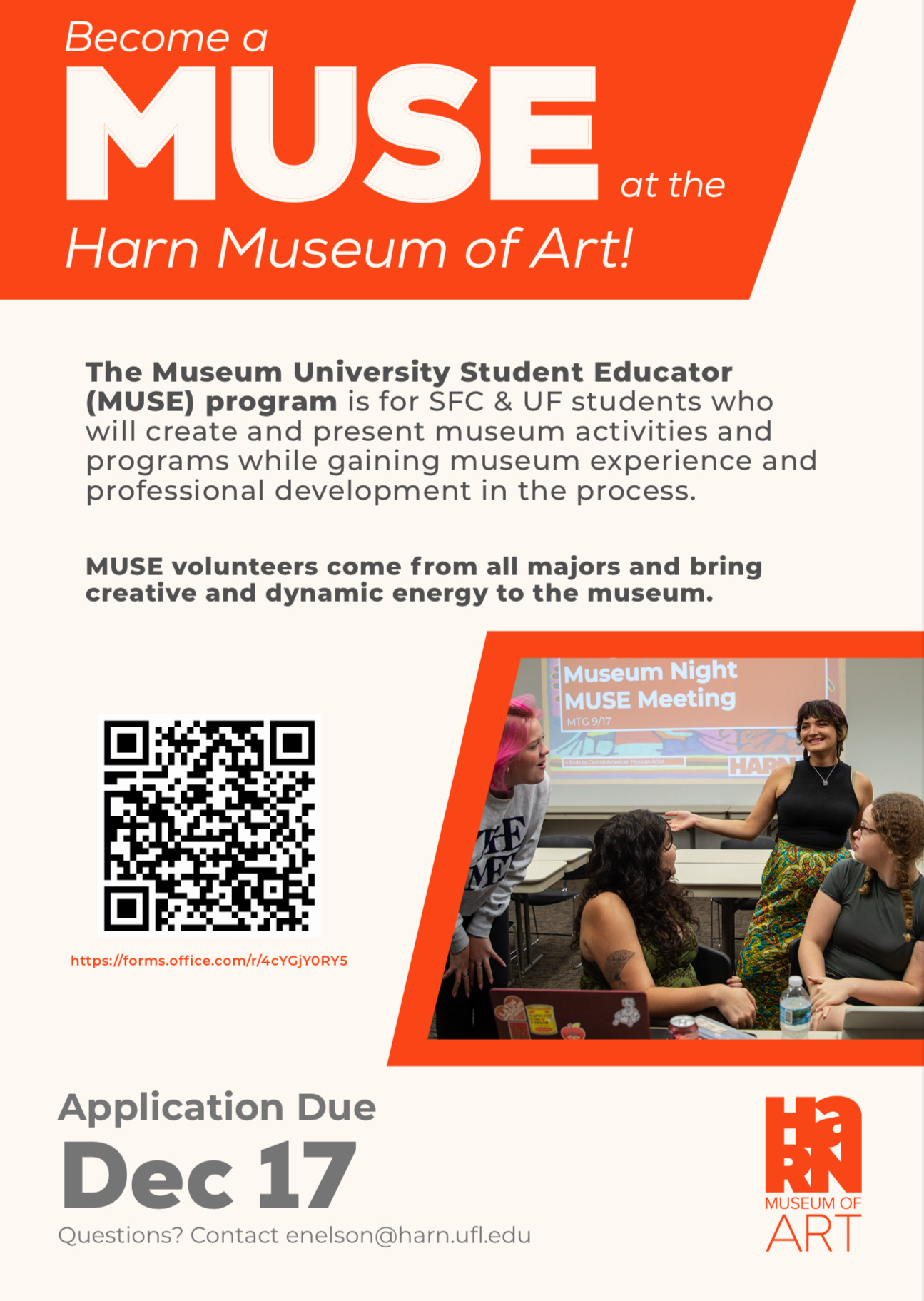 The Museum University Student Educator (MUSE) program at the Harn Museum of Art is now recruiting new volunteers!
