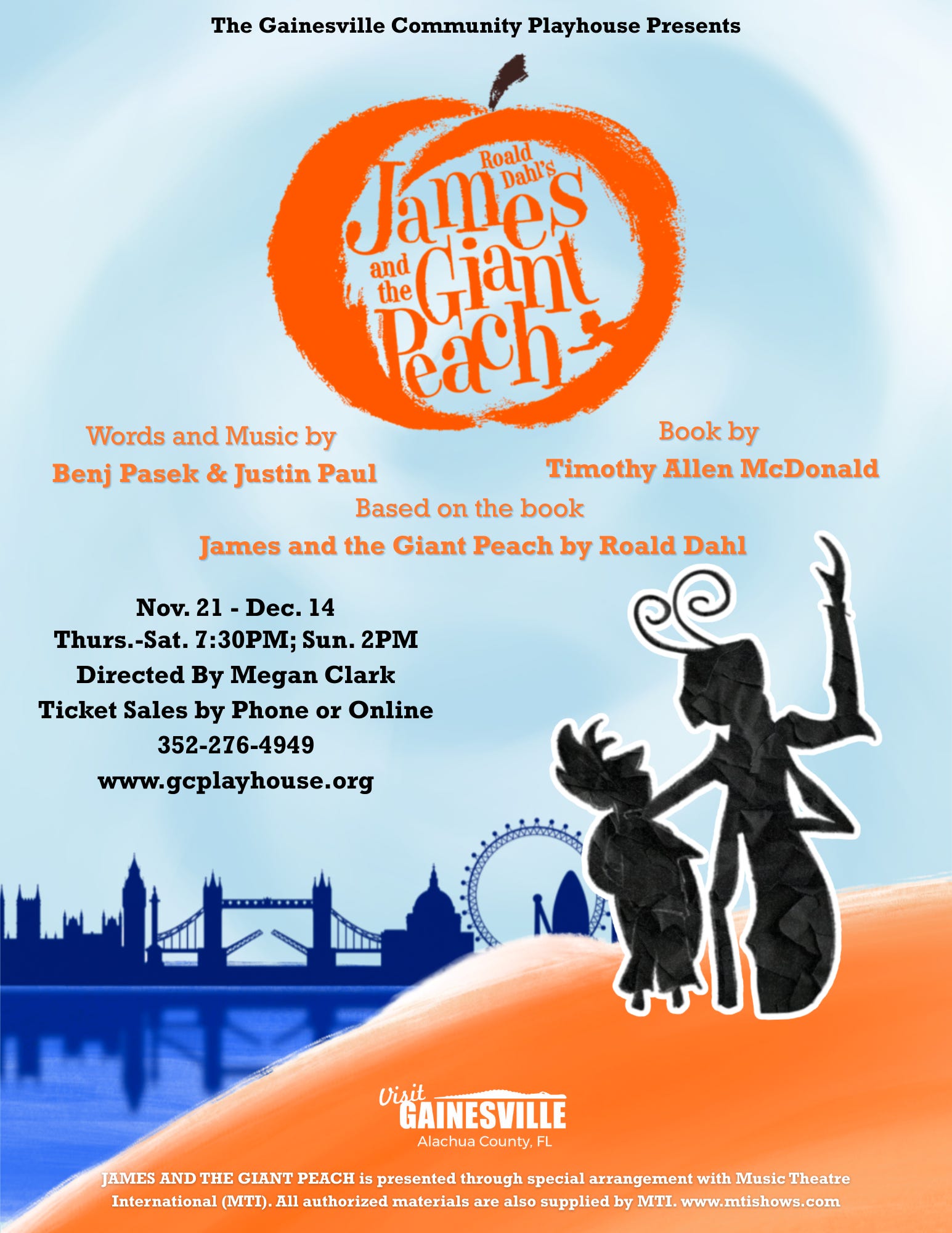 Celebrate the arrival of the holiday season by attending a family-friendly performance of James and the Giant Peach at the historic Gainesville Community Playhouse. This joyous, high-flying adventure reminds us that friendship, hope, and a little bit of magic can make anywhere feel like home. This adaptation of Roald Dahl’s classic tale blends dazzling imagination with Broadway-caliber music.