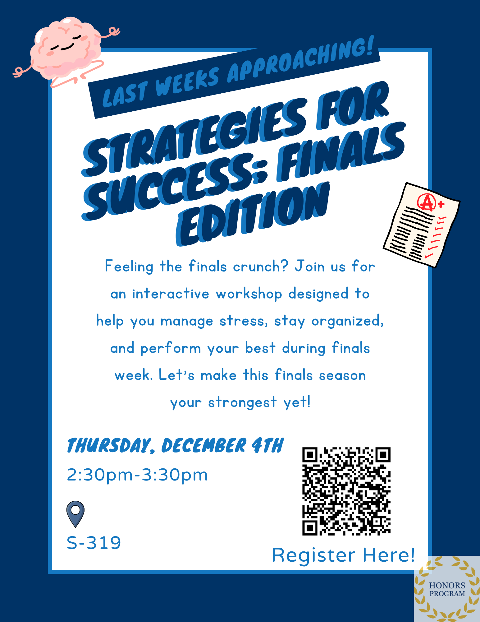Stressed about finals? You’re not alone. Join us for a student-led workshop where we’ll give and swap helpful tips, tools, and techniques that have helped us succeed during finals week.