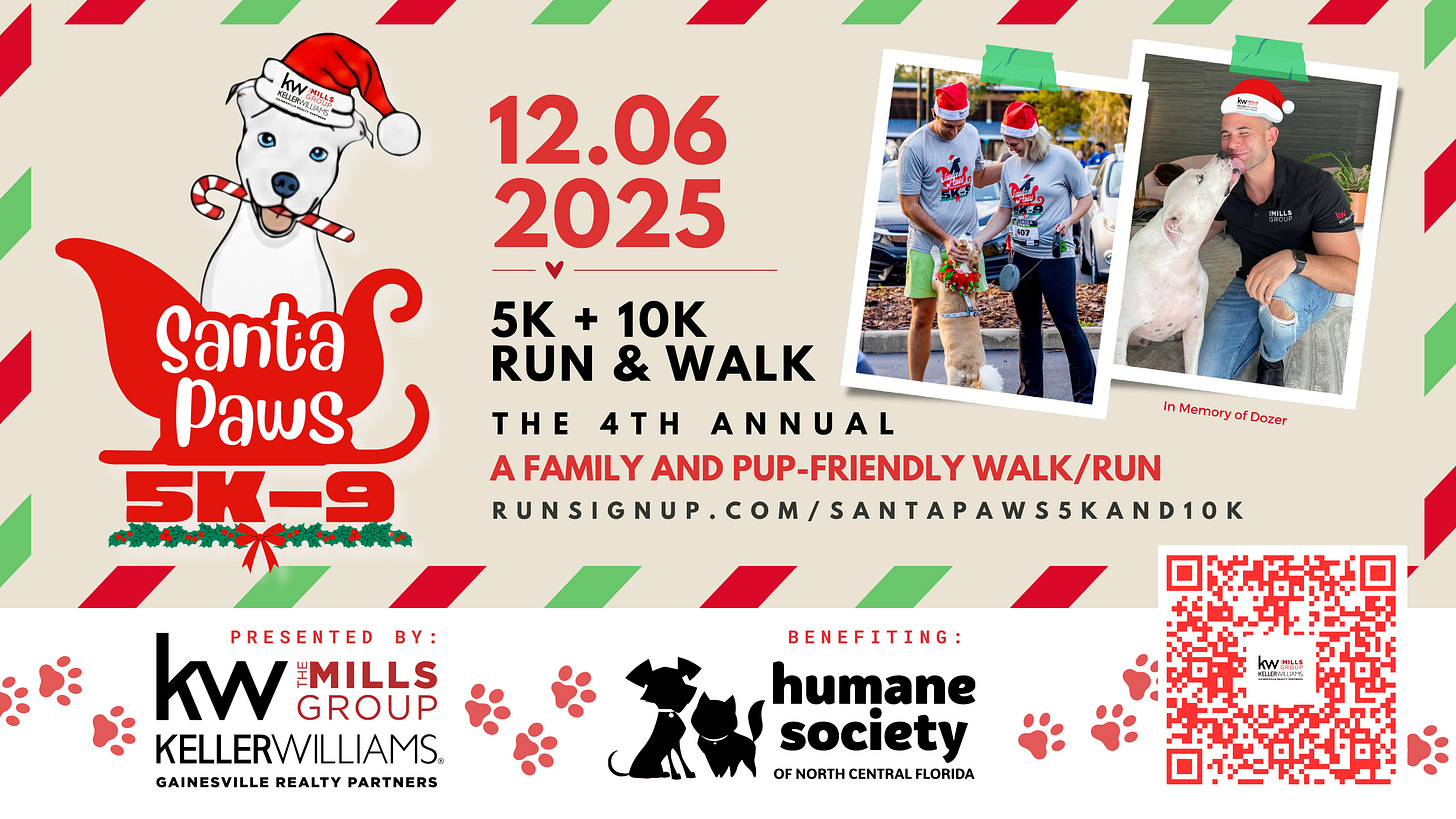 Join the 4th Annual Santa Paws 5K-9 and 10K-9, a run and walk bringing people and their dogs together for a meaningful cause. This year’s event honors the memory of Dozer, celebrating the bond between pets and their owners. Participants support The Humane Society of North Central Florida, helping animals in need while enjoying a community-focused event full of activity, camaraderie, and holiday spirit.