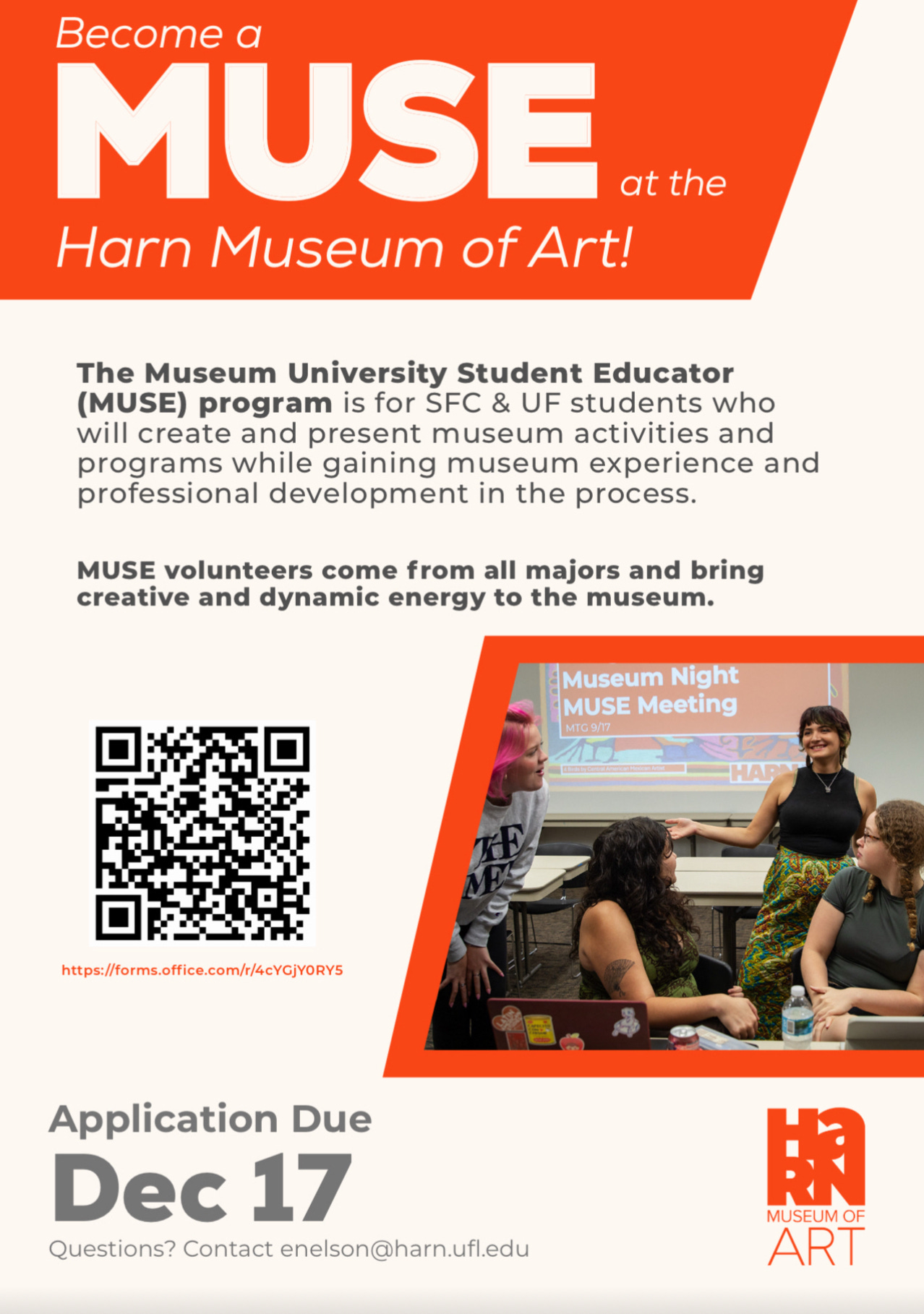 The Museum University Student Educator (MUSE) program at the Harn Museum of Art is now recruiting new volunteers!