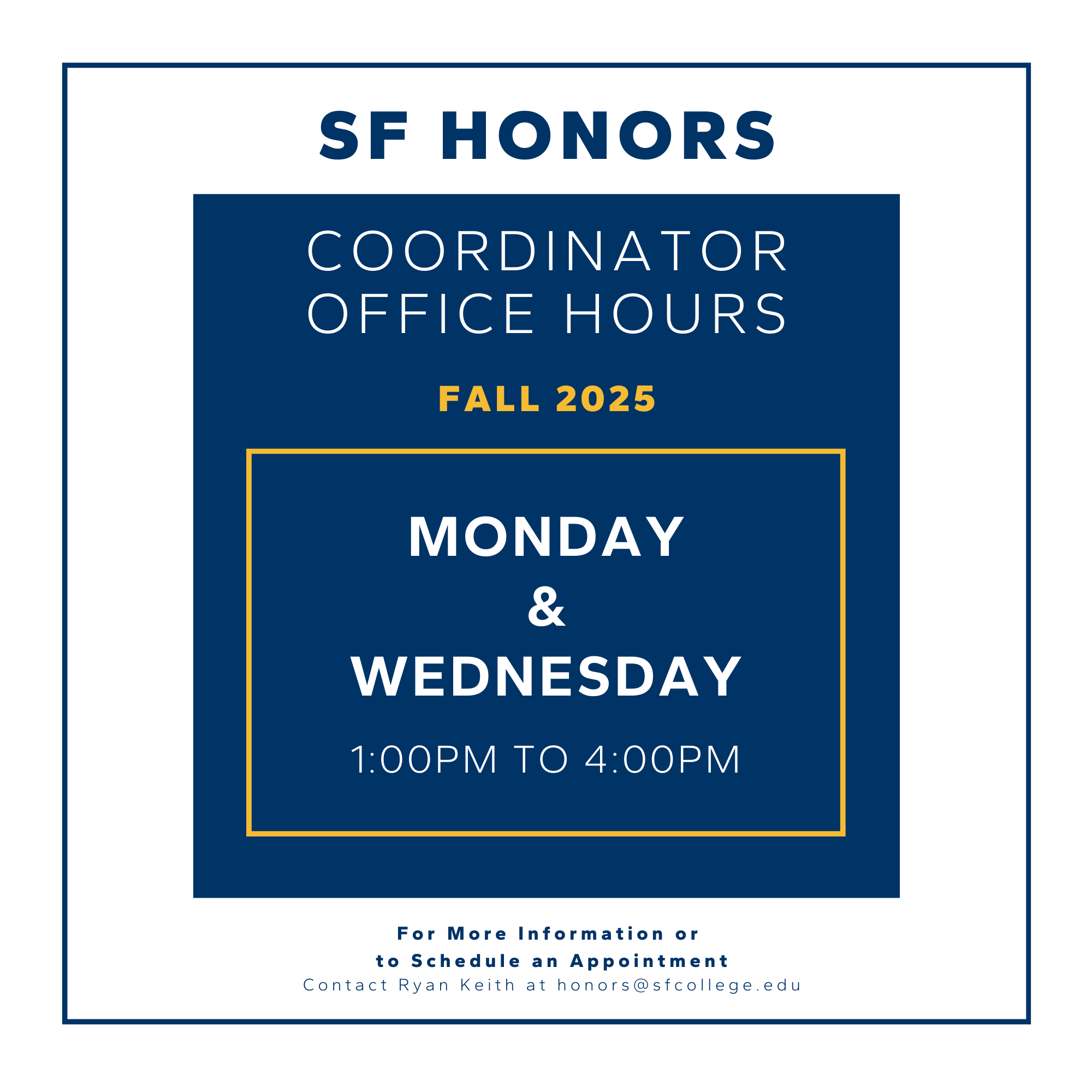 This semester, we’ve got even more ways to connect with you and support you on your Honors journey. Below, you’ll find office hours for meeting with the Honors Coordinator. For now, all hours are drop-in and in-person. If you have a pressing issue and can’t come during office hours, send me an email at ryan.keith@sfcollege.edu or make use of one of the resources below. Chances are, we can fix things quickly via email, but we can also set up an appointment, if necessary. Also, keep an eye out soon for a schedule for meeting with Honors Navigators. This semester, we have a tremendous team of Navigators and you’ll be able to connect with them in office and virtually.